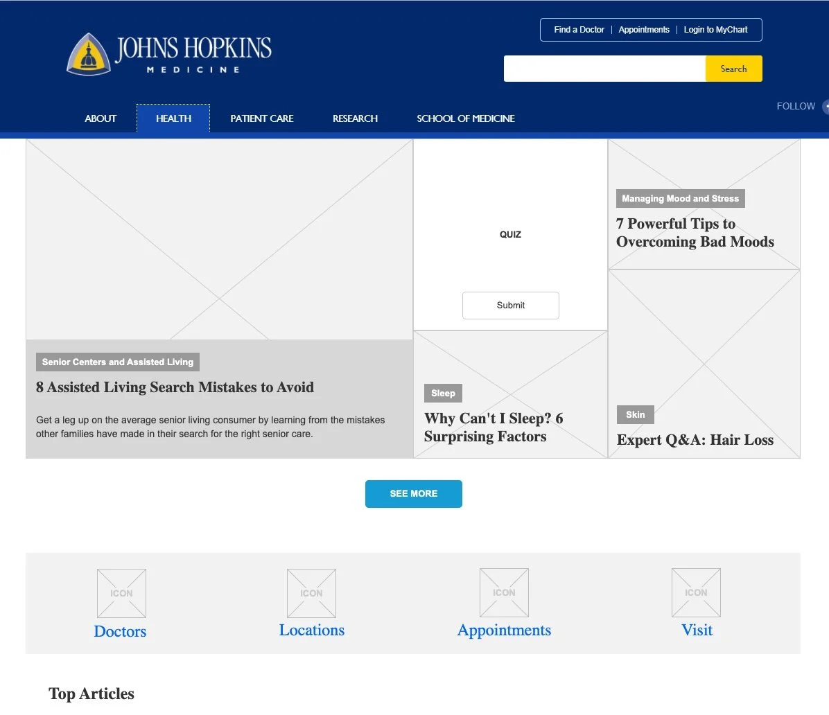I oversaw the digital strategy and experience design efforts for the redesigned Johns Hopkins Medicine’s Health site, which supported the need for sharing key COVID-19 response content during the pandemic. The site garnered 10x it’s normal traffic and won Sitecore’s highest award: Experience Awards.