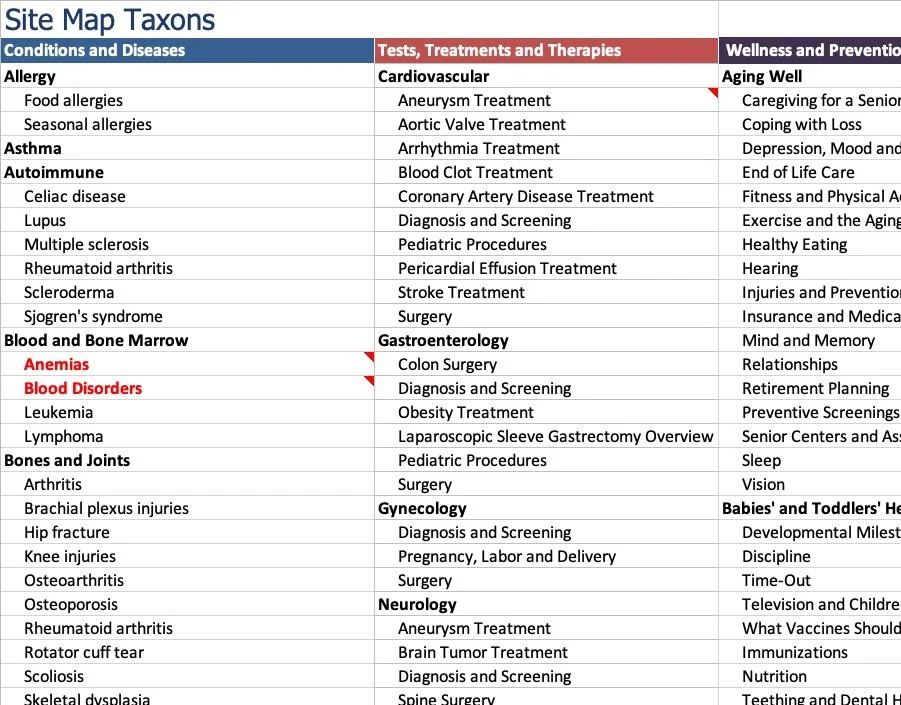 Johns Hopkins Medicine (JHM) began with multiple, ungoverned taxonomies that had been mapped to generic health terms from a licensed content infrastructure. The relationships that had been created between the JHM taxonomies and the licensed content taxonomies allowed JHM to display their doctors and services alongside health articles.